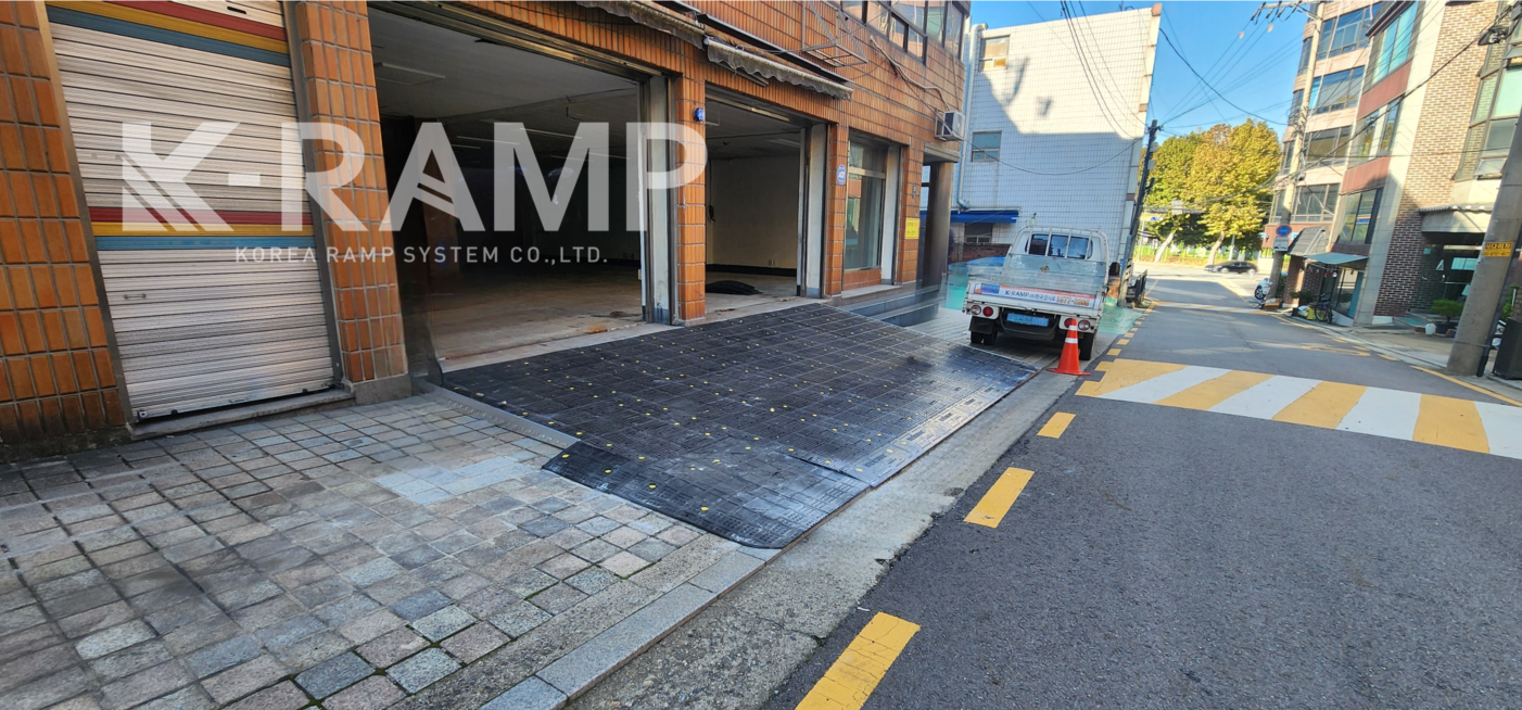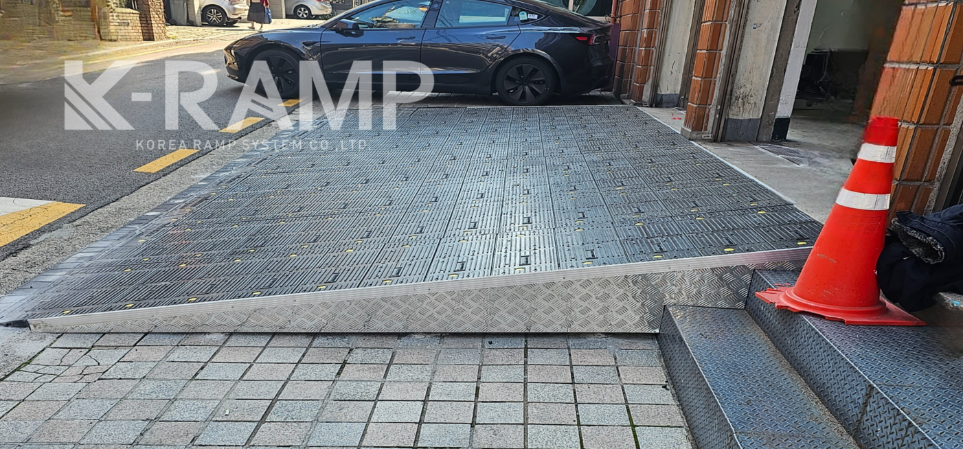 전기차가 들어갈 매장 출입구 턱에 차량용 경사로(주문제작 카업)를 설치했습니다.