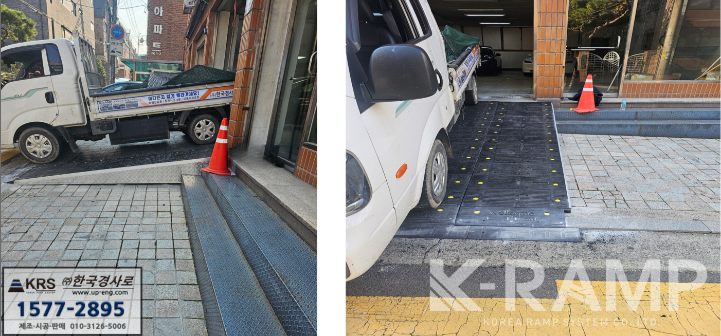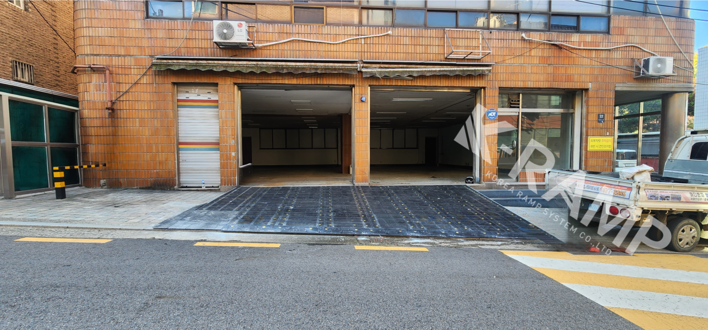 전기차가 들어갈 매장 출입구 턱에 차량용 경사로(주문제작 카업)를 설치했습니다.