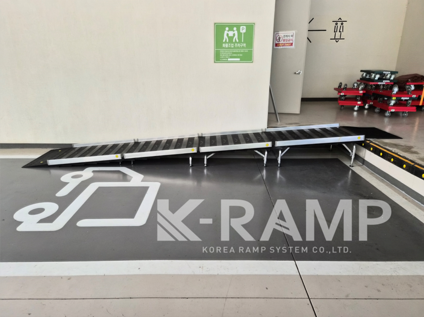필요 시에만 주차장에 설치할 수 있도록 폭 900mm 의 PE 이동식 경사로 설치를 완료했습니다.